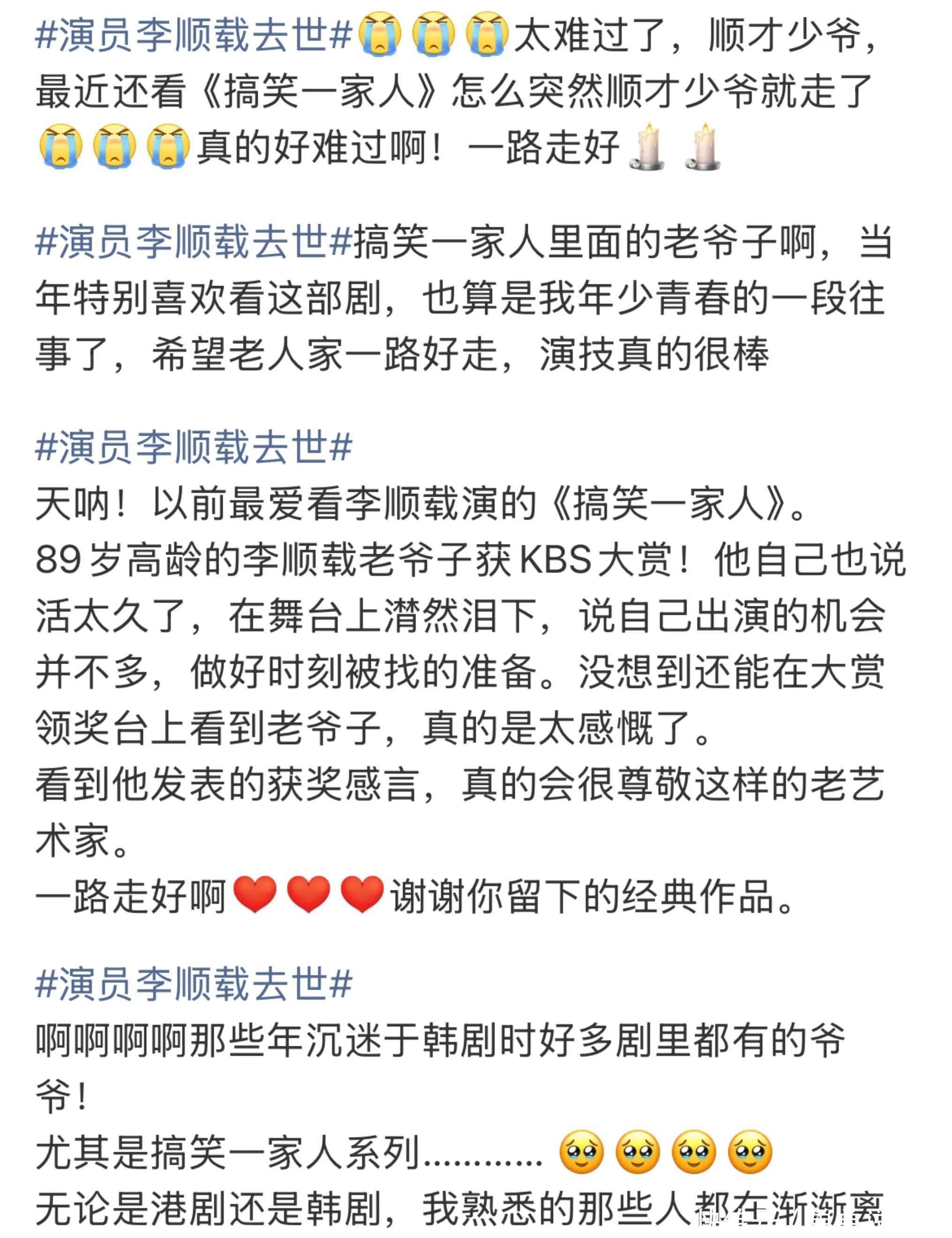 看到一名网友留言:荧幕里的顺才少爷只是去了更高维度的宇宙继续搞笑。突然又豁然开朗了,相比缅怀,更要想开用乐观的心态面对世界李顺载老先生离世,荧幕里的顺才少爷只是去了更高维度的宇宙继续搞笑青春年华虽然逝去了,但人还在,还可以与更多的人和物熟悉,创造更多的回忆!